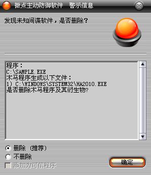 已安装使用微点主动防御软件的用户,无须任何设置,微点主动防御将自动保护您的系统免受该病毒的入侵和破坏。无论您是否已经升级到最新版本,微点主动防御都能够有效清除该病毒。如果您没有将微点主动防御软件升级到最新版,微点主动防御软件在发现该病毒后将报警提示您发现“未知间谍”,请直接选择删除处理(如图1)