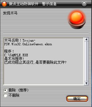 如果您已经将微点主动防御软件升级到最新版本,微点将报警提示您发现木马"Trojan-PSW.Win32.OnLineGames.ekxn”,请直接选择删除(如图2)。