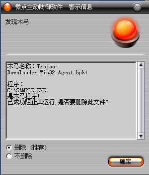 如果您已经将微点主动防御软件升级到最新版本,微点将报警提示您发现木马"Trojan-Downloader.Win32.Agent.bpkt”,请直接选择删除(如图2)。