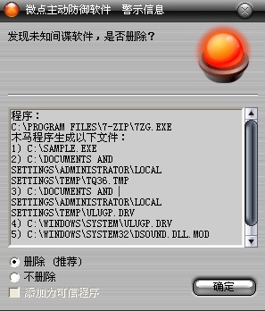 如果您没有将微点主动防御软件升级到最新版,微点主动防御软件在发现该病毒后将报警提示您发现“未知间谍软件”,请直接选择删除处理(如图1)