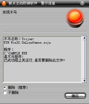 如果您已经将微点主动防御软件升级到最新版本,微点将报警提示您发现木马"Trojan-PSW. Win32.WOW.qzy”,请直接选择删除(如图2)。