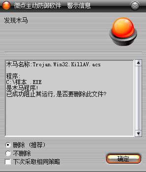 如果您已经将微点主动防御软件升级到最新版本,微点将报警提示您发现"Trojan.Win32.KillAV.acs”,请直接选择删除(如图2)。