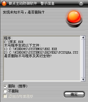 已安装使用微点主动防御软件的用户,无须任何设置,微点主动防御将自动保护您的系统免受该病毒的入侵和破坏。无论您是否已经升级到最新版本,微点主动防御都能够有效清除该病毒。如果您没有将微点主动防御软件升级到最新版,微点主动防御软件在发现该病毒后将报警提示您发现“未知木马”,请直接选择删除处理(如图1);