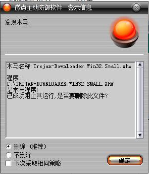 如果您已经将微点主动防御软件升级到最新版本,微点将报警提示您发现"Trojan-Downloader.Win32.Small.xhw”,请直接选择删除(如图2)。