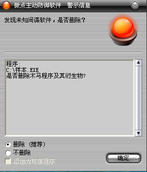 已安装使用微点主动防御软件的用户,无须任何设置,微点主动防御将自动保护您的系统免受该病毒的入侵和破坏。无论您是否已经升级到最新版本,微点主动防御都能够有效清除该病毒。如果您没有将微点主动防御软件升级到最新版,微点主动防御软件在发现该病毒后将报警提示您发现“未知间谍软件”,请直接选择删除处理(如图1);