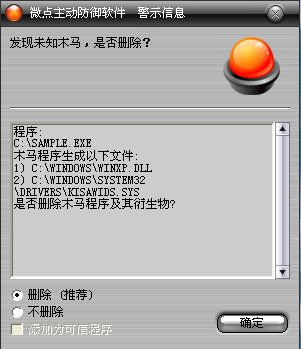 已安装使用微点主动防御软件的用户,无须任何设置,微点主动防御将自动保护您的系统免受该病毒的入侵和破坏。无论您是否已经升级到最新版本,微点主动防御都能够有效清除该病毒。如果您没有将微点主动防御软件升级到最新版,微点主动防御软件在发现该病毒后将报警提示您发现“未知木马”,请直接选择删除处理(如图1);