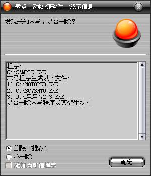 已安装使用微点主动防御软件的用户,无须任何设置,微点主动防御将自动保护您的系统免受该病毒的入侵和破坏。无论您是否已经升级到最新版本,微点主动防御都能够有效清除该病毒。如果您没有将微点主动防御软件升级到最新版,微点主动防御软件在发现该病毒后将报警提示您发现“未知木马”,请直接选择删除处理(如图1);