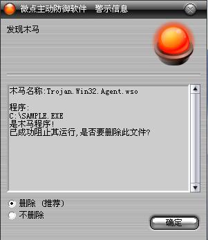 如果您已经将微点主动防御软件升级到最新版本,微点将报警提示您发现"Trojan.Win32.Agent.wso”,请直接选择删除(如图2)。