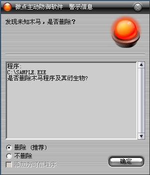 已安装使用微点主动防御软件的用户,无须任何设置,微点主动防御将自动保护您的系统免受该病毒的入侵和破坏。无论您是否已经升级到最新版本,微点主动防御都能够有效清除该病毒。如果您没有将微点主动防御软件升级到最新版,微点主动防御软件在发现该病毒后将报警提示您发现“未知木马”,请直接选择删除处理(如图1);