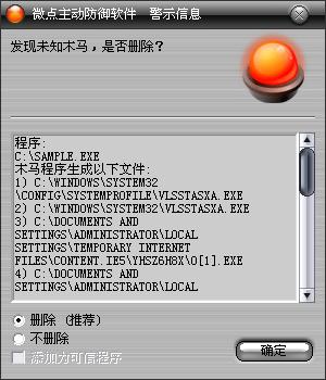 已安装使用微点主动防御软件的用户,无须任何设置,微点主动防御将自动保护您的系统免受该病毒的入侵和破坏。无论您是否已经升级到最新版本,微点主动防御都能够有效清除该病毒。如果您没有将微点主动防御软件升级到最新版,微点主动防御软件在发现该病毒后将报警提示您发现“未知木马”,请直接选择删除处理(如图1);