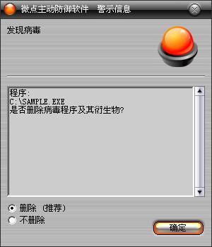 已安装使用微点主动防御软件的用户,无须任何设置,微点主动防御将自动保护您的系统免受该病毒的入侵和破坏。无论您是否已经升级到最新版本,微点主动防御都能够有效清除该病毒。如果您没有将微点主动防御软件升级到最新版,微点主动防御软件在发现该病毒后将报警提示您发现“未知病毒”,请直接选择删除处理(如图1);