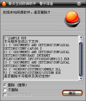 已安装使用微点主动防御软件的用户,无须任何设置,微点主动防御将自动保护您的系统免受该病毒的入侵和破坏。无论您是否已经升级到最新版本,微点主动防御都能够有效清除该病毒。如果您没有将微点主动防御软件升级到最新版,微点主动防御软件在发现该病毒后将报警提示您发现“未知间谍软件”,请直接选择删除处理(如图1);