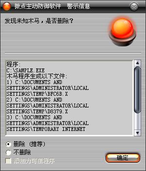 已安装使用微点主动防御软件的用户,无须任何设置,微点主动防御将自动保护您的系统免受该病毒的入侵和破坏。无论您是否已经升级到最新版本,微点主动防御都能够有效清除该病毒。如果您没有将微点主动防御软件升级到最新版,微点主动防御软件在发现该病毒后将报警提示您发现“未知木马”,请直接选择删除处理(如图1);