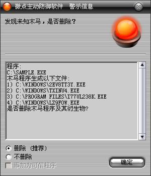 已安装使用微点主动防御软件的用户,无须任何设置,微点主动防御将自动保护您的系统免受该病毒的入侵和破坏。无论您是否已经升级到最新版本,微点主动防御都能够有效清除该病毒。如果您没有将微点主动防御软件升级到最新版,微点主动防御软件在发现该病毒后将报警提示您发现“未知木马”,请直接选择删除处理(如图1);