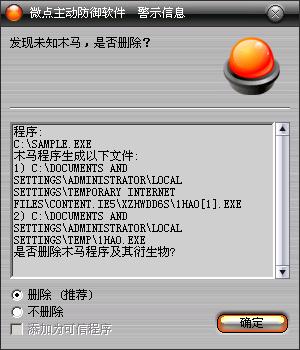 已安装使用微点主动防御软件的用户,无须任何设置,微点主动防御将自动保护您的系统免受该病毒的入侵和破坏。无论您是否已经升级到最新版本,微点主动防御都能够有效清除该病毒。如果您没有将微点主动防御软件升级到最新版,微点主动防御软件在发现该病毒后将报警提示您发现“未知木马”,请直接选择删除处理(如图1);