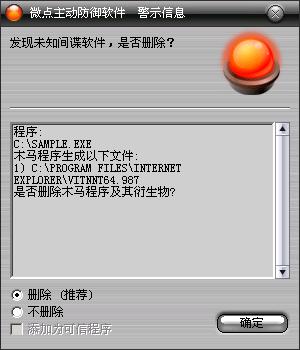 已安装使用微点主动防御软件的用户,无须任何设置,微点主动防御将自动保护您的系统免受该病毒的入侵和破坏。无论您是否已经升级到最新版本,微点主动防御都能够有效清除该病毒。如果您没有将微点主动防御软件升级到最新版,微点主动防御软件在发现该病毒后将报警提示您发现“未知间谍软件”,请直接选择删除处理(如图1);