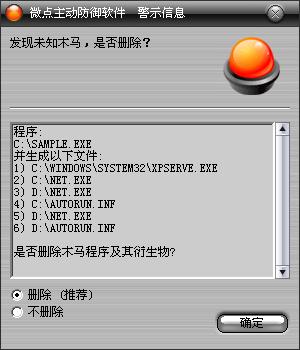 如果您已经将微点主动防御软件升级到最新版本,微点将报警提示您发现"Worm.Win32.AutoRun.imd”,请直接选择删除(如图2)。