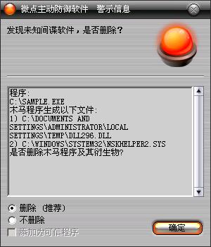 已安装使用微点主动防御软件的用户,无须任何设置,微点主动防御将自动保护您的系统免受该病毒的入侵和破坏。无论您是否已经升级到最新版本,微点主动防御都能够有效清除该病毒。如果您没有将微点主动防御软件升级到最新版,微点主动防御软件在发现该病毒后将报警提示您发现“未知间谍软件”,请直接选择删除处理(如图1);