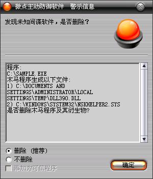 已安装使用微点主动防御软件的用户,无须任何设置,微点主动防御将自动保护您的系统免受该病毒的入侵和破坏。无论您是否已经升级到最新版本,微点主动防御都能够有效清除该病毒。如果您没有将微点主动防御软件升级到最新版,微点主动防御软件在发现该病毒后将报警提示您发现“未知间谍软件”,请直接选择删除处理(如图1);