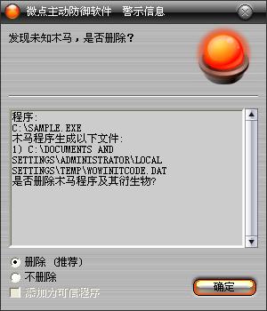 已安装使用微点主动防御软件的用户,无须任何设置,微点主动防御将自动保护您的系统免受该病毒的入侵和破坏。无论您是否已经升级到最新版本,微点主动防御都能够有效清除该病毒。如果您没有将微点主动防御软件升级到最新版,微点主动防御软件在发现该病毒后将报警提示您发现“可疑程序”,请直接选择删除处理(如图1);