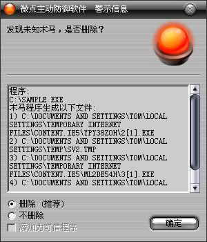 已安装使用微点主动防御软件的用户,无须任何设置,微点主动防御将自动保护您的系统免受该病毒的入侵和破坏。无论您是否已经升级到最新版本,微点主动防御都能够有效清除该病毒。如果您没有将微点主动防御软件升级到最新版,微点主动防御软件在发现该病毒后将报警提示您发现“未知木马”,请直接选择删除处理(如图1);