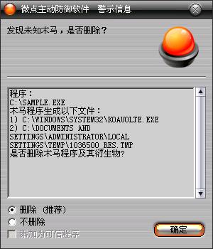 已安装使用微点主动防御软件的用户,无须任何设置,微点主动防御将自动保护您的系统免受该病毒的入侵和破坏。无论您是否已经升级到最新版本,微点主动防御都能够有效清除该病毒。如果您没有将微点主动防御软件升级到最新版,微点主动防御软件在发现该病毒后将报警提示您发现“未知木马”,请直接选择删除处理(如图1);