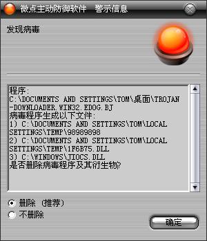 如果您已经将微点主动防御软件升级到最新版本,微点将报警提示您发现"Trojan-Downloader.Win32.EDog.bj”,请直接选择删除(如图2)。