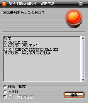 已安装使用微点主动防御软件的用户,无须任何设置,微点主动防御将自动保护您的系统免受该病毒的入侵和破坏。无论您是否已经升级到最新版本,微点主动防御都能够有效清除该病毒。如果您没有将微点主动防御软件升级到最新版,微点主动防御软件在发现该病毒后将报警提示您发现“未知木马”,请直接选择删除处理(如图1);