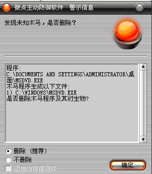 已安装使用微点主动防御软件的用户,无须任何设置,微点主动防御将自动保护您的系统免受该病毒的入侵和破坏。无论您是否已经升级到最新版本,微点主动防御都能够有效清除该病毒。如果您没有将微点主动防御软件升级到最新版,微点主动防御软件在发现该病毒后将报警提示您发现“未知木马”,请直接选择删除处理(如图1);