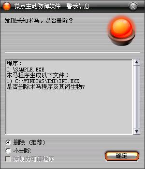 已安装使用微点主动防御软件的用户,无须任何设置,微点主动防御将自动保护您的系统免受该病毒的入侵和破坏。无论您是否已经升级到最新版本,微点主动防御都能够有效清除该病毒。如果您没有将微点主动防御软件升级到最新版,微点主动防御软件在发现该病毒后将报警提示您发现“未知木马”,请直接选择删除处理(如图1);