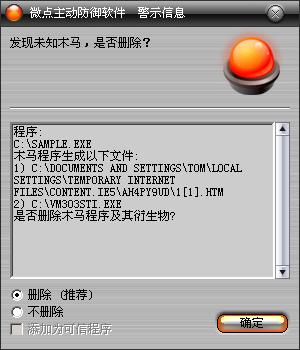 图1 微点主动防御软件自动捕获未知病毒(未升级)