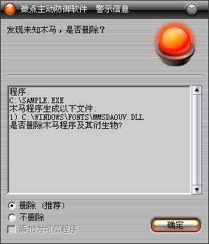 已安装使用微点主动防御软件的用户,无须任何设置,微点主动防御将自动保护您的系统免受该病毒的入侵和破坏。无论您是否已经升级到最新版本,微点主动防御都能够有效清除该病毒。如果您没有将微点主动防御软件升级到最新版,微点主动防御软件在发现该病毒后将报警提示您发现“未知木马”,请直接选择删除处理(如图1);