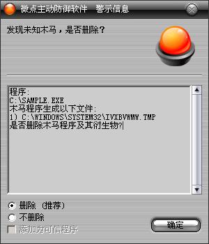 已安装使用微点主动防御软件的用户,无须任何设置,微点主动防御将自动保护您的系统免受该病毒的入侵和破坏。无论您是否已经升级到最新版本,微点主动防御都能够有效清除该病毒。如果您没有将微点主动防御软件升级到最新版,微点主动防御软件在发现该病毒后将报警提示您发现“未知木马”,请直接选择删除处理(如图1);
