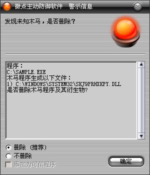 已安装使用微点主动防御软件的用户,无须任何设置,微点主动防御将自动保护您的系统免受该病毒的入侵和破坏。无论您是否已经升级到最新版本,微点主动防御都能够有效清除该病毒。如果您没有将微点主动防御软件升级到最新版,微点主动防御软件在发现该病毒后将报警提示您发现“未知木马”,请直接选择删除处理(如图1);