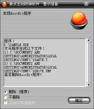 已安装使用微点主动防御软件的用户,无须任何设置,微点主动防御将自动保护您的系统免受该病毒的入侵和破坏。无论您是否已经升级到最新版本,微点主动防御都能够有效清除该病毒。如果您没有将微点主动防御软件升级到最新版,微点主动防御软件在发现该病毒后将报警提示您发现“RooKit程序”,请直接选择删除处理(如图1);