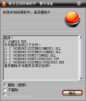 已安装使用微点主动防御软件的用户,无须任何设置,微点主动防御将自动保护您的系统免受该病毒的入侵和破坏。无论您是否已经升级到最新版本,微点主动防御都能够有效清除该病毒。如果您没有将微点主动防御软件升级到最新版,微点主动防御软件在发现该病毒后将报警提示您发现“未知木马”,请直接选择删除处理(如图1);