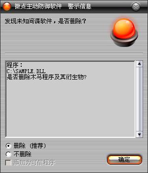 已安装使用微点主动防御软件的用户,无须任何设置,微点主动防御将自动保护您的系统免受该病毒的入侵和破坏。无论您是否已经升级到最新版本,微点主动防御都能够有效清除该病毒。如果您没有将微点主动防御软件升级到最新版,微点主动防御软件在发现该病毒后将报警提示您发现“未知间谍软件”,请直接选择删除处理(如图1);