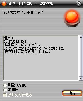 已安装使用微点主动防御软件的用户,无须任何设置,微点主动防御将自动保护您的系统免受该病毒的入侵和破坏。无论您是否已经升级到最新版本,微点主动防御都能够有效清除该病毒。如果您没有将微点主动防御软件升级到最新版,微点主动防御软件在发现该病毒后将报警提示您发现“未知木马”,请直接选择删除处理(如图1);