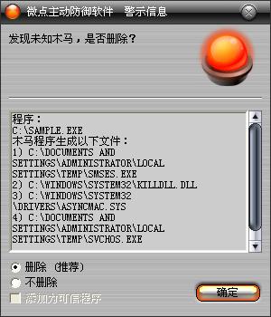 已安装使用微点主动防御软件的用户,无须任何设置,微点主动防御将自动保护您的系统免受该病毒的入侵和破坏。无论您是否已经升级到最新版本,微点主动防御都能够有效清除该病毒。如果您没有将微点主动防御软件升级到最新版,微点主动防御软件在发现该病毒后将报警提示您发现“未知木马”,请直接选择删除处理(如图1);