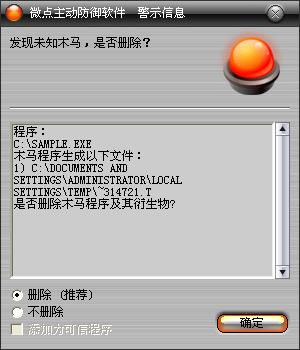 已安装使用微点主动防御软件的用户,无须任何设置,微点主动防御将自动保护您的系统免受该病毒的入侵和破坏。无论您是否已经升级到最新版本,微点主动防御都能够有效清除该病毒。如果您没有将微点主动防御软件升级到最新版,微点主动防御软件在发现该病毒后将报警提示您发现“未知木马”,请直接选择删除处理(如图1);