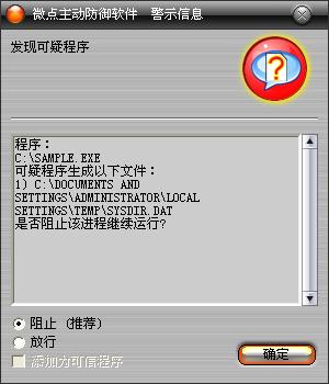 已安装使用微点主动防御软件的用户,无须任何设置,微点主动防御将自动保护您的系统免受该病毒的入侵和破坏。无论您是否已经升级到最新版本,微点主动防御都能够有效清除该病毒。如果您没有将微点主动防御软件升级到最新版,微点主动防御软件在发现该病毒后将报警提示您发现“可疑程序”,请直接选择删除处理(如图1);