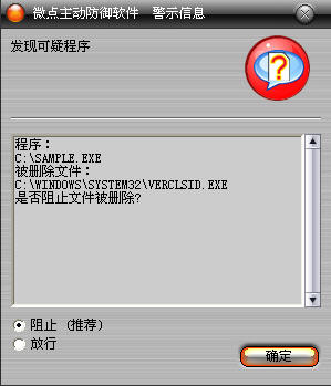已安装使用微点主动防御软件的用户,无须任何设置,微点主动防御将自动保护您的系统免受该病毒的入侵和破坏。无论您是否已经升级到最新版本,微点主动防御都能够有效清除该病毒。如果您没有将微点主动防御软件升级到最新版,微点主动防御软件在发现该病毒后将报警提示您发现“未知木马”,请直接选择删除处理(如图1);