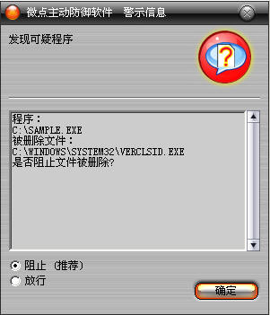 已安装使用微点主动防御软件的用户,无须任何设置,微点主动防御将自动保护您的系统免受该病毒的入侵和破坏。无论您是否已经升级到最新版本,微点主动防御都能够有效清除该病毒。如果您没有将微点主动防御软件升级到最新版,微点主动防御软件在发现该病毒后将报警提示您发现“可疑程序”,请直接选择删除处理(如图1);