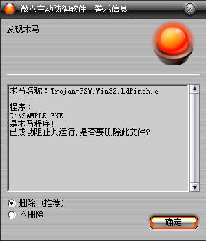 如果您已经将微点主动防御软件升级到最新版本,微点将报警提示您发现"Trojan-PSW.Win32.LdPinch.e”,请直接选择删除(如图2)。
