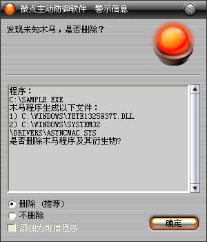已安装使用微点主动防御软件的用户,无须任何设置,微点主动防御将自动保护您的系统免受该病毒的入侵和破坏。无论您是否已经升级到最新版本,微点主动防御都能够有效清除该病毒。如果您没有将微点主动防御软件升级到最新版,微点主动防御软件在发现该病毒后将报警提示您发现“未知木马”,请直接选择删除处理(如图1);