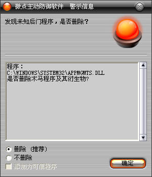 已安装使用微点主动防御软件的用户,无须任何设置,微点主动防御将自动保护您的系统免受该病毒的入侵和破坏。无论您是否已经升级到最新版本,微点主动防御都能够有效清除该病毒。如果您没有将微点主动防御软件升级到最新版,微点主动防御软件在发现该病毒后将报警提示您发现“未知后门程序”,请直接选择删除处理(如图1);