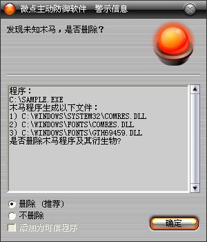 已安装使用微点主动防御软件的用户,无须任何设置,微点主动防御将自动保护您的系统免受该病毒的入侵和破坏。无论您是否已经升级到最新版本,微点主动防御都能够有效清除该病毒。如果您没有将微点主动防御软件升级到最新版,微点主动防御软件在发现该病毒后将报警提示您发现“未知木马”,请直接选择删除处理(如图1);