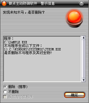 已安装使用微点主动防御软件的用户,无须任何设置,微点主动防御将自动保护您的系统免受该病毒的入侵和破坏。无论您是否已经升级到最新版本,微点主动防御都能够有效清除该病毒。如果您没有将微点主动防御软件升级到最新版,微点主动防御软件在发现该病毒后将报警提示您发现“未知木马”,请直接选择删除处理(如图1);
