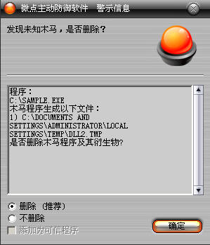 已安装使用微点主动防御软件的用户,无须任何设置,微点主动防御将自动保护您的系统免受该病毒的入侵和破坏。无论您是否已经升级到最新版本,微点主动防御都能够有效清除该病毒。如果您没有将微点主动防御软件升级到最新版,微点主动防御软件在发现该病毒后将报警提示您发现“未知木马”,请直接选择删除处理(如图1);