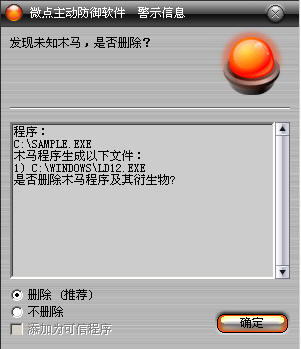 已安装使用微点主动防御软件的用户,无须任何设置,微点主动防御将自动保护您的系统免受该病毒的入侵和破坏。无论您是否已经升级到最新版本,微点主动防御都能够有效清除该病毒。如果您没有将微点主动防御软件升级到最新版,微点主动防御软件在发现该病毒后将报警提示您发现“未知木马”,请直接选择删除处理(如图1);